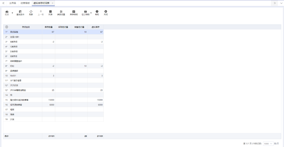 該表的主要構(gòu)成要素包括庫存數(shù)量,采購在訂量,銷售在訂量以及虛擬庫存數(shù)量。具體的虛擬庫存計(jì)算公式可以在軟件上方參數(shù)設(shè)置界面,根據(jù)不同需求進(jìn)行具體配置。