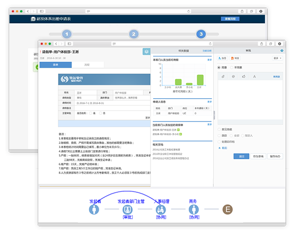 流程隨時(shí)申請(qǐng),移動(dòng)快速審批; 可加簽、會(huì)簽、知會(huì)和回退等,使移動(dòng)審批更靈活方便。
